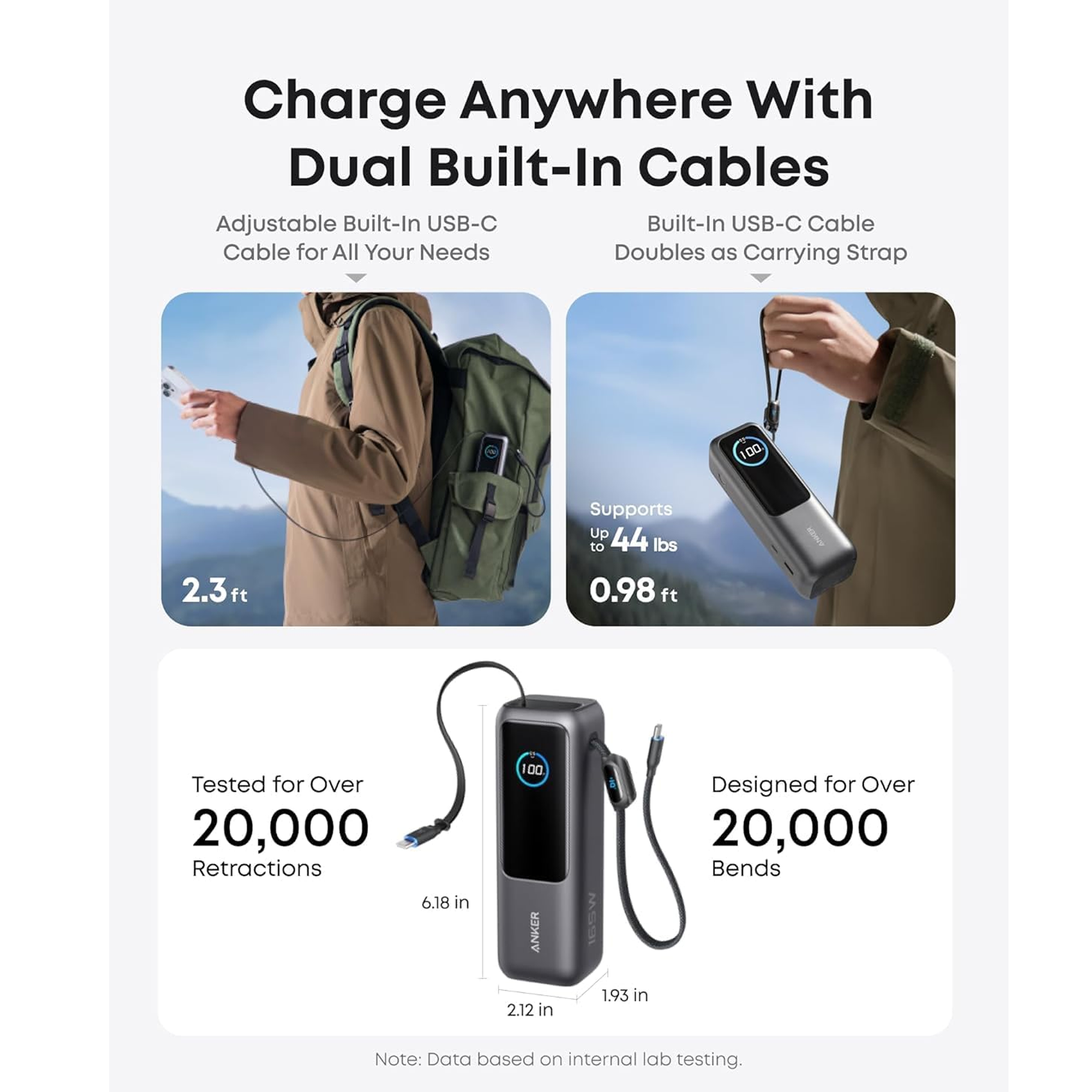 كابلات مزدوجة مدمجة للاستخدام أثناء التنقل: مزودة بكابلين USB-C، أحدهما قابل للتمديد حتى 2.3 قدم لأكثر من 20000 عملية سحب، والآخر بطول 0.98 قدم يعمل كحزام حمل متين قادر على تحمل أكثر من 20000 انحناء.