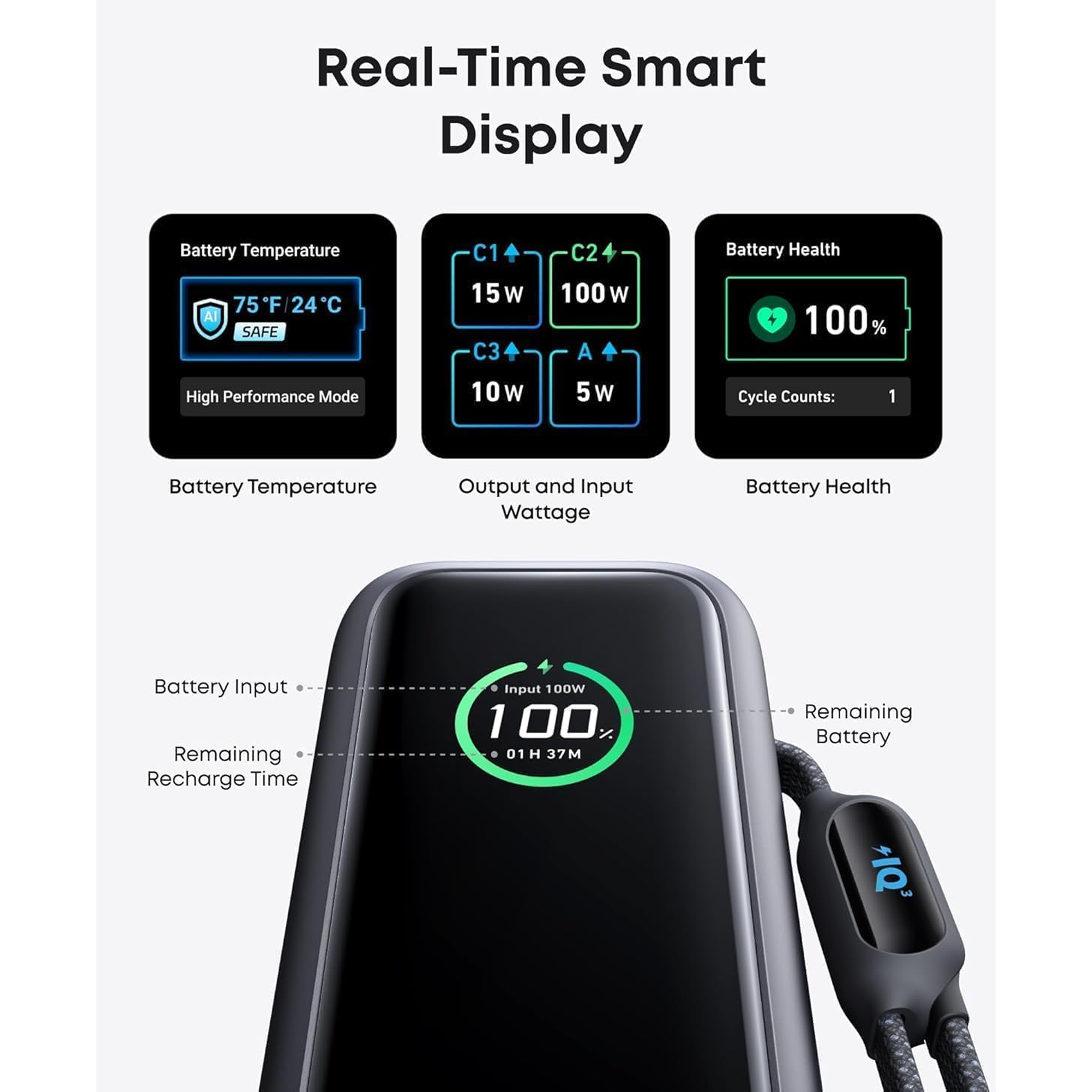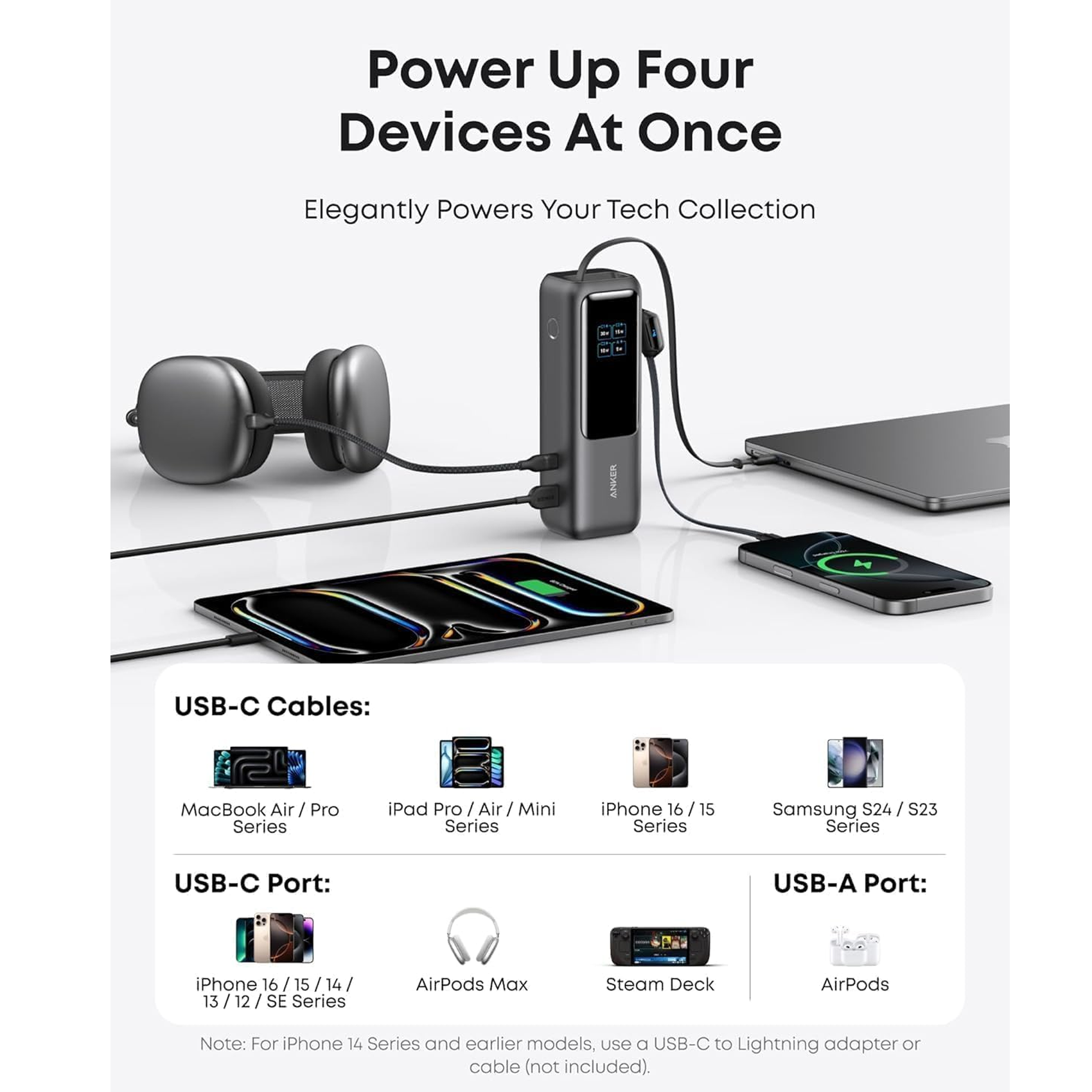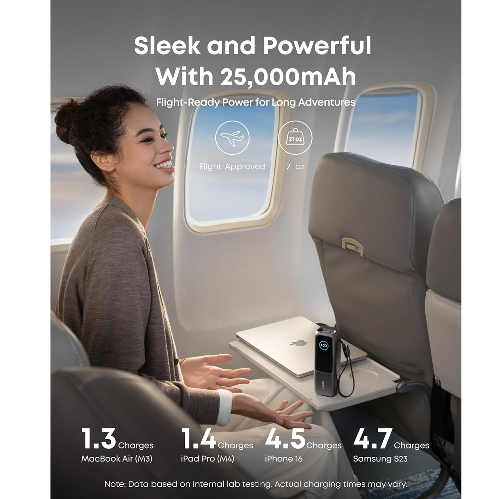 ما تحصل عليه: بنك الطاقة Anker (25K، 165W، كابلات مدمجة وقابلة للسحب)، حقيبة واقية، دليل المستخدم، ضمان لمدة 18 شهرًا، وخدمة العملاء الودودة لدينا.