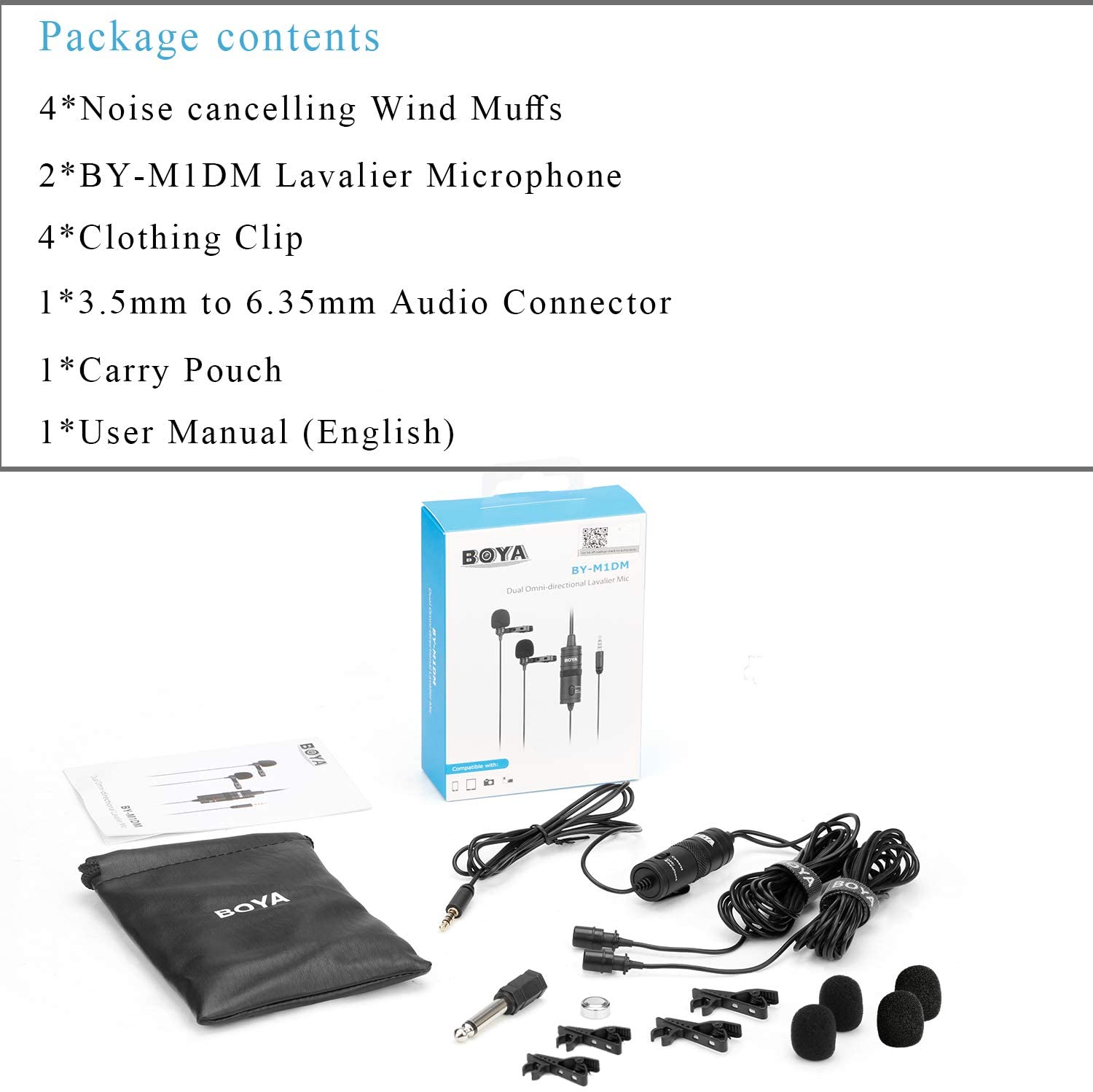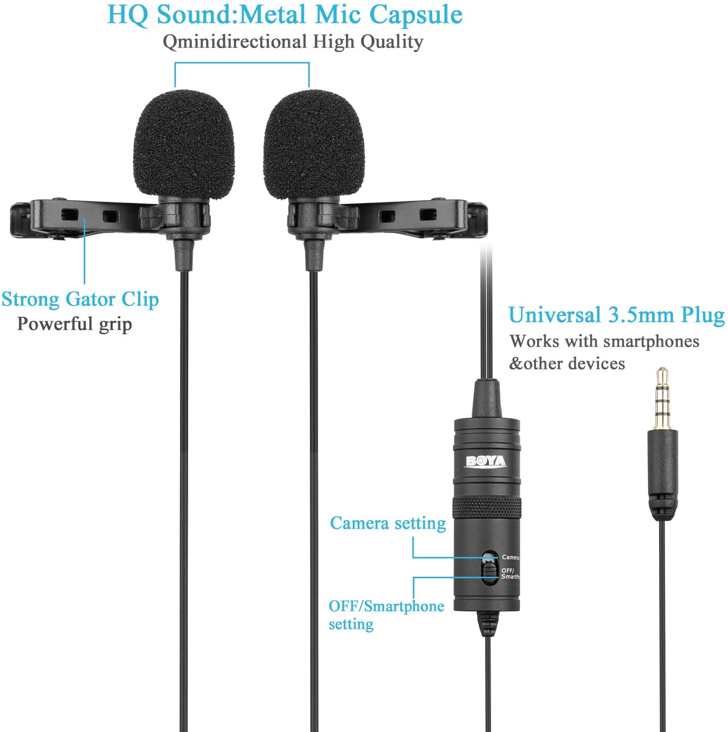 BOYA BY-M1DM هو ميكروفون عالمي مزدوج، مع موصل واحد 1/8 بوصة، ويمكن استخدامه مع الهواتف الذكية وكاميرات DSLR وكاميرات الفيديو ومسجلات الصوت وأجهزة الكمبيوتر وأجهزة التسجيل الأخرى.