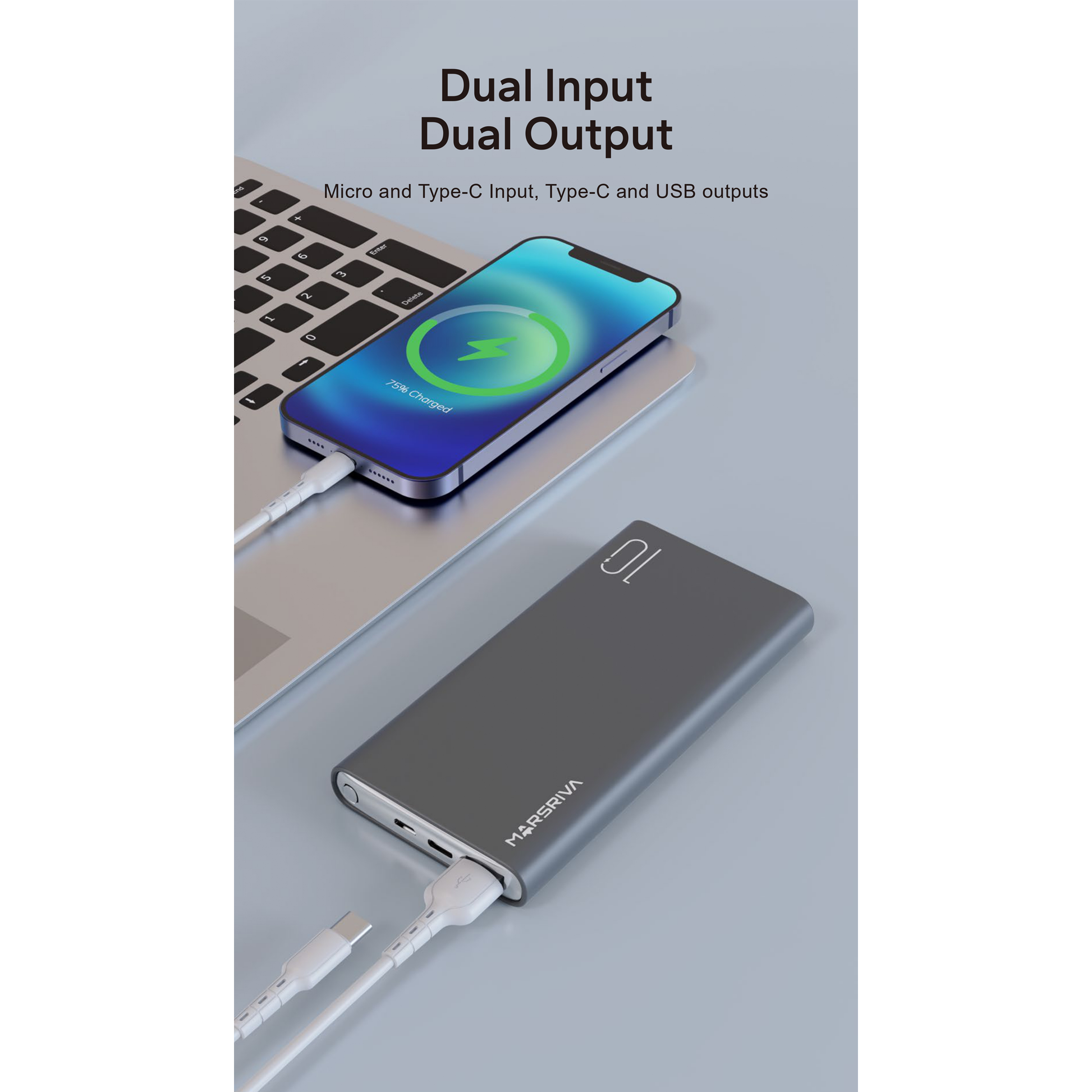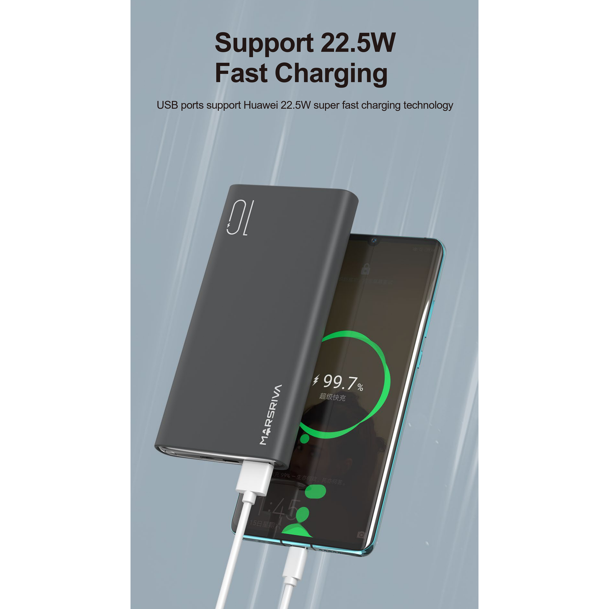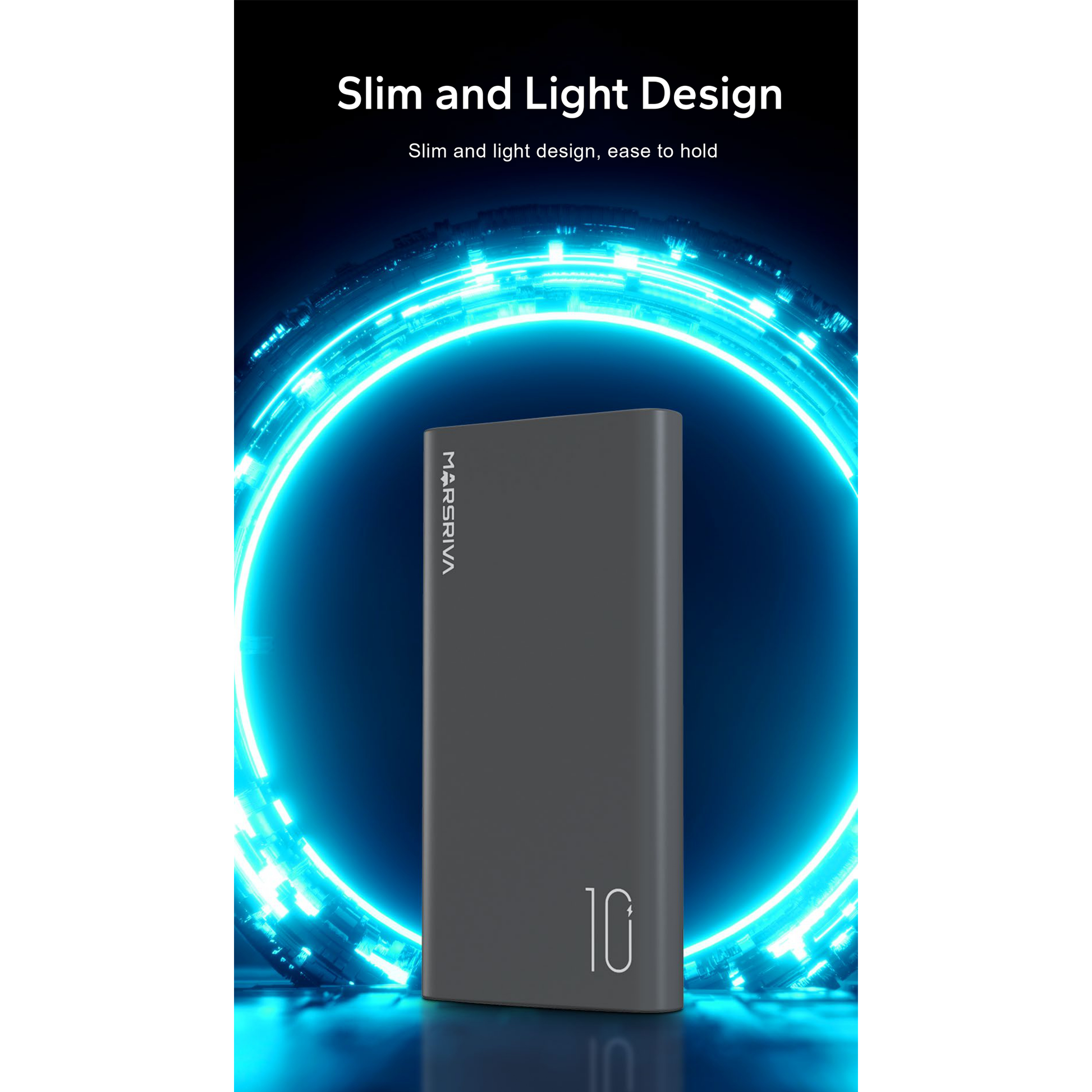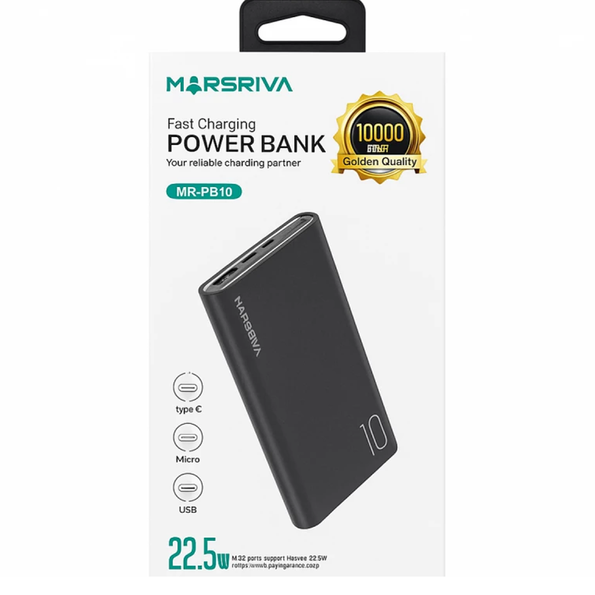 شاحن MARSRIVA MR-PB10 بسعة 10000 مللي أمبير مع خاصية الشحن السريع، مصمم لتوفير طاقة محمولة سريعة وموثوقة. يتميز بتصميم صغير الحجم ومتين، ويدعم الشحن السريع للهواتف الذكية والأجهزة اللوحية، كما أنه متوافق مع مجموعة واسعة من الأجهزة، مما يجعله مثالياً للسفر والاستخدام اليومي.