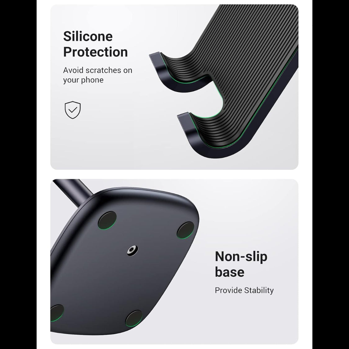 Scratch and non-slip - UGREEN table mobile phone holder with non-slip rubber coating on the whole shelf surface guarantees the stability and safety of your mobile phone. Four rubber nubs at the bottom further reduce the risk of slipping or ugly scratching marks on the table.