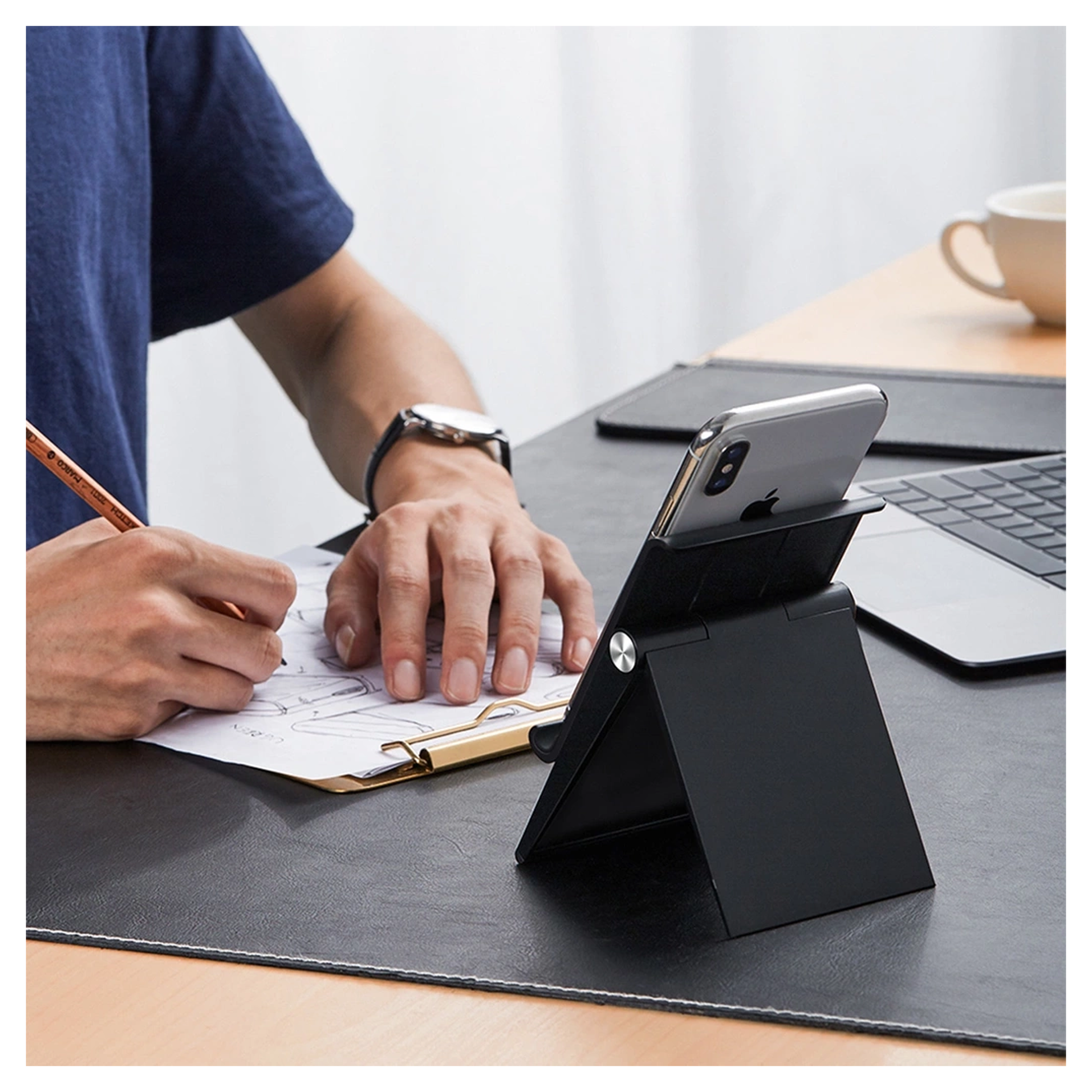 UGREEN cell phone stand for desk can be easily slid upward to lock thus you can place your iphone on an upper and more comfortable viewing angle. When you unlock it and slide it down, this phone holder is quite simple to fold and take for travel.
