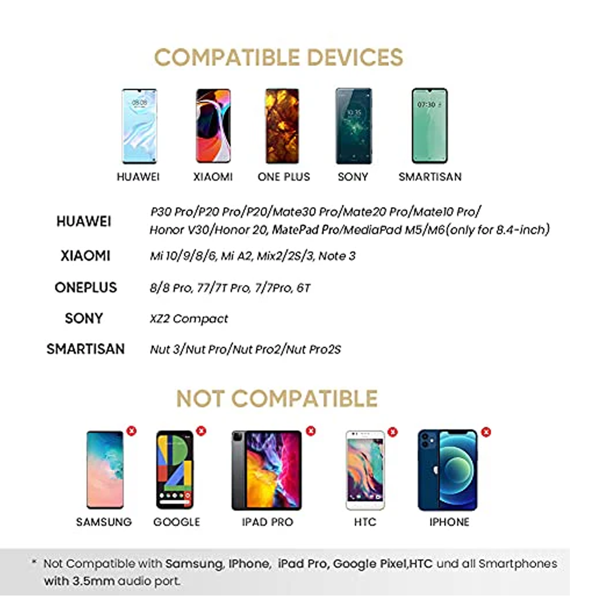 Limited Compatibility: Without built-in DAC chipset, this USB C to 3.5mm Headphone Jack Adapter only supports the listed devices: Huawei P40/P40 Pro/P30 Pro/P20/P20 Pro/Mate 20 Pro/Mate 20 RS/Mate10 Pro/Nova 7 Pro/Nova 6/Nova 5 Pro/MediaPad M6 8.4/MediaPad M5, OnePlus 10 Pro/Nord 2/9/9 Pro/8T/8 Pro/7T/7T Pro/7 Pro/7/6T, Find X5 Pro/X3 Pro/Reno5/Reno6/Reno4 Pro,Mi 11,Honor 20 Pro/Note 10. The 4-pole TRRS Aux female port supports OMTP & CTIA headphone,earphone,car radio,speaker.