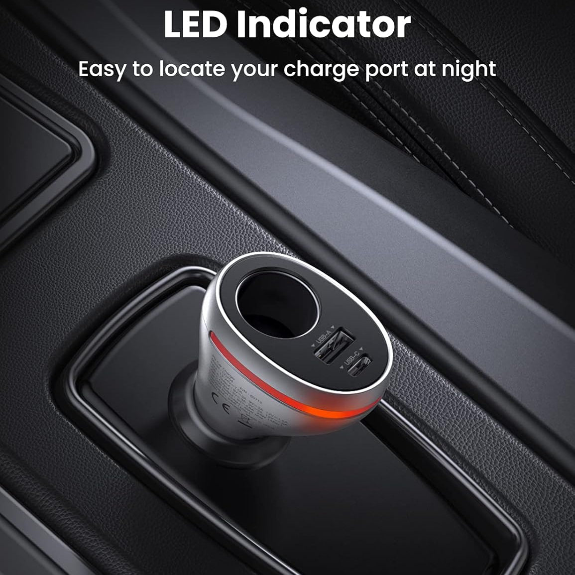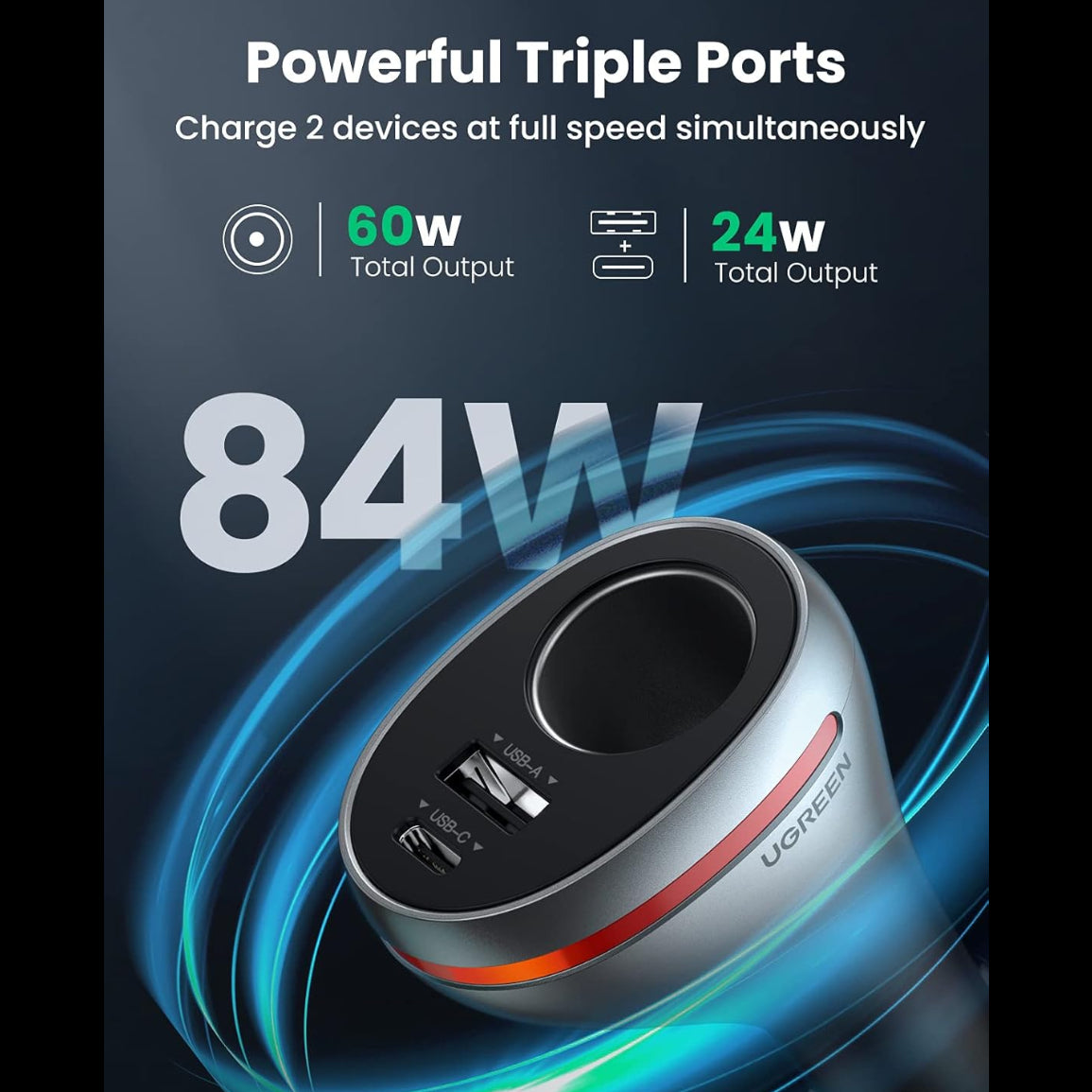 The UGREEN 84W USB-C Car Charger (Model: 60712) is a powerful, multi-port charging solution designed to keep your devices powered up on the go. Equipped with a PD 20W USB-C port, an 18W QC USB-A port, and a 60W cigarette lighter extension, this charger allows simultaneous fast charging for smartphones, tablets, GPS devices, and more.