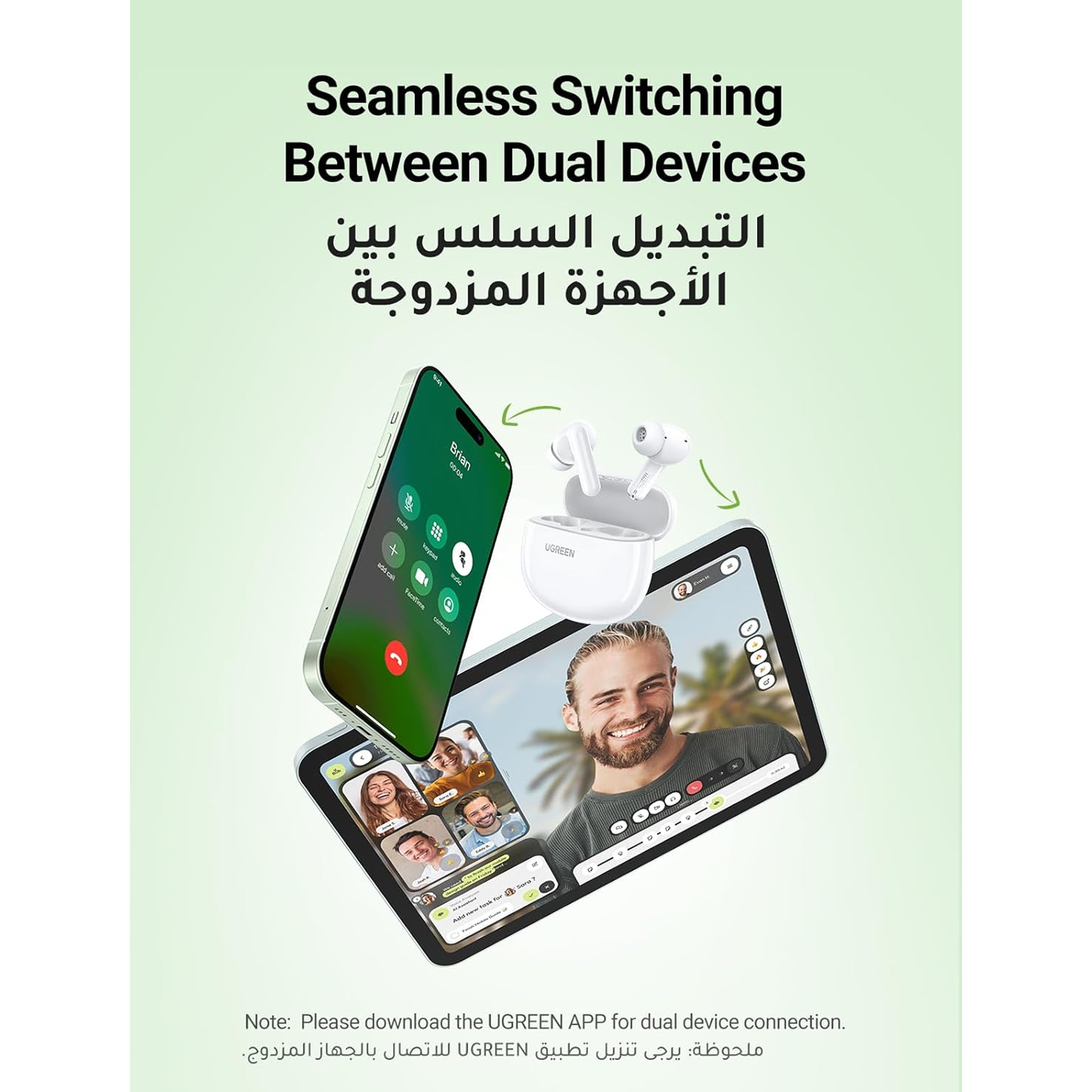 Switch between Two Devices Freely The earbuds allow you to connect two devices simultaneously via the APP so you can switch anytime. NOTE: Please download the UGREEN APP to use this function.