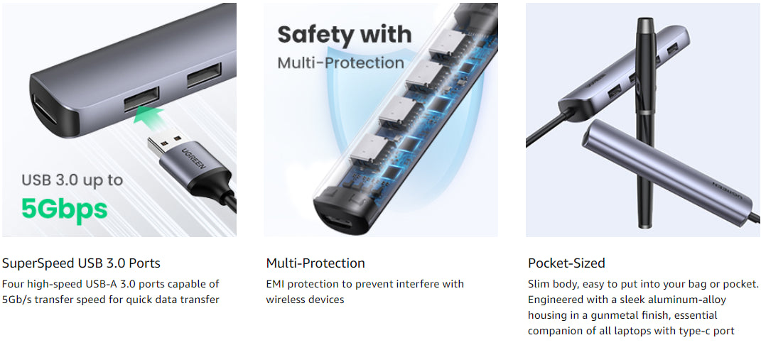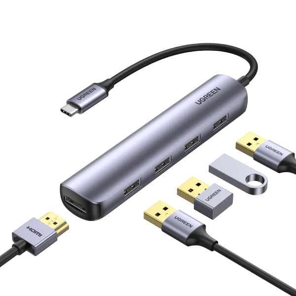 - All in One Solution: UGREEN 5-in-1 USB C Hub includes 1 HDMI port and 4 USB 3.0 ports, plug-and-play for extending your type c laptop or other devices. Allowing you to connect a keyboard, USB driver or external Disk to your USB-C devices. This USB C hub applies to most of the Type-C laptops.